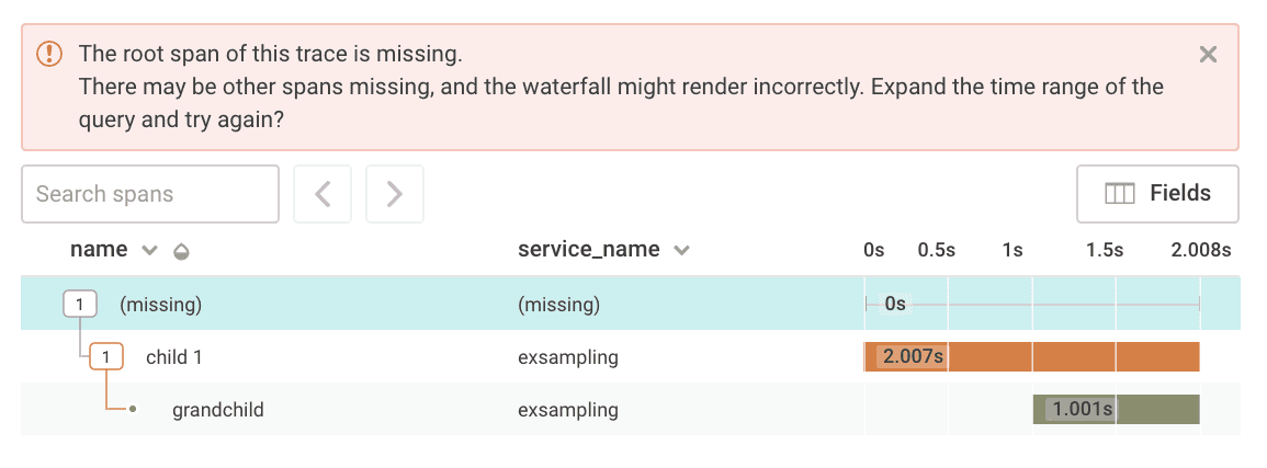 endAnother common pitfall occurs with tail-based sampling. With tail-based sampling, the decision to drop an entire trace is based on some value that is set in the middle of a request. If that happens, the result can lead to orphaned child spans, which get sent to Honeycomb before the entire request completes and the trace-level data is sent.