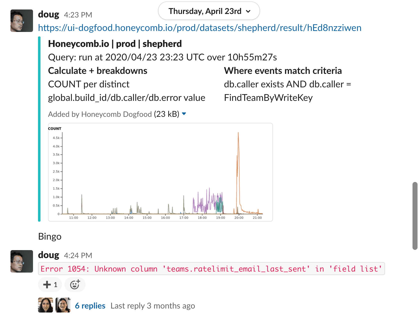 Once these new hosts spun up, they attempted to query for new API keys to authenticate incoming traffic. Outgoing queries from this new build contained a new column that’s supposed to be created via a database migration–the one that had not run yet. These new hosts requested a column that didn’t exist, so a 500 error got thrown on the first attempt.