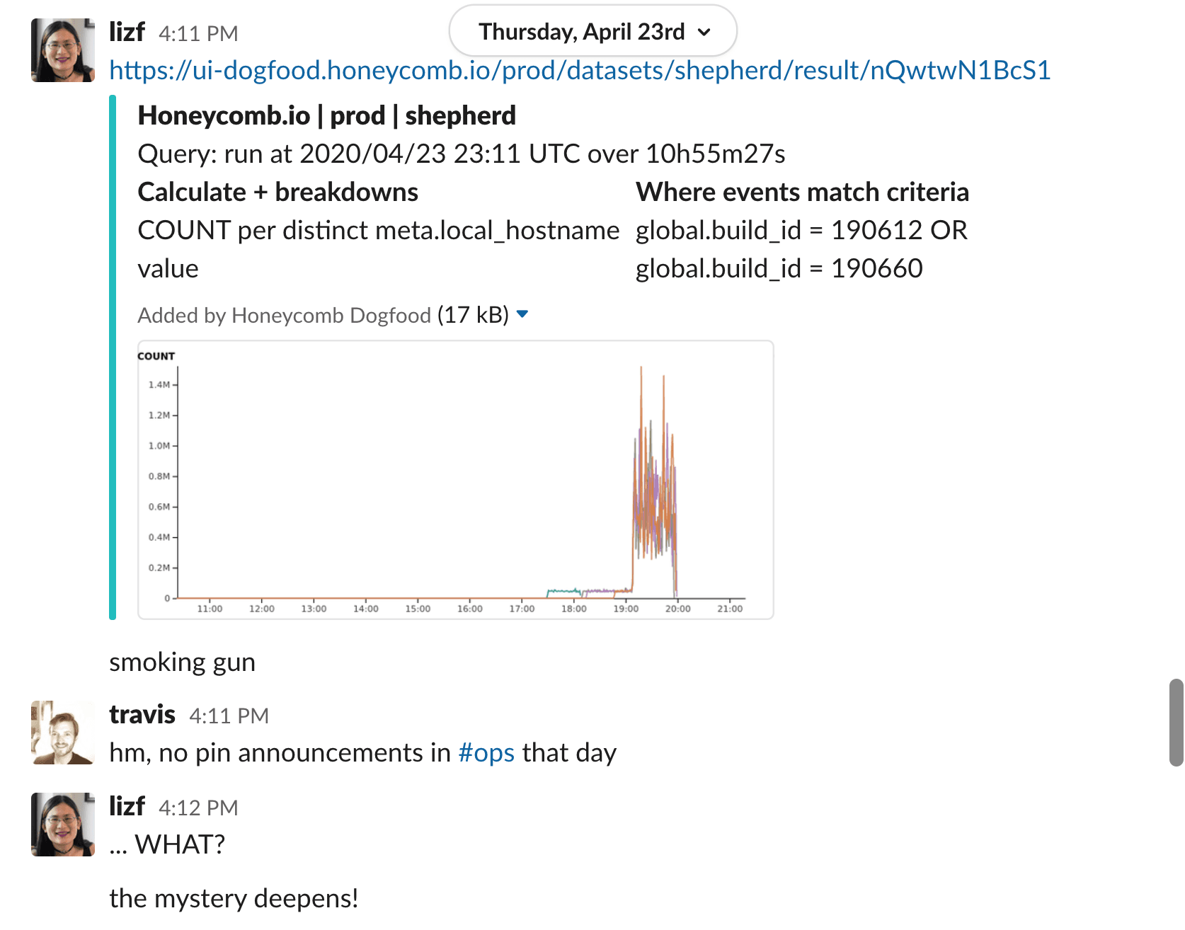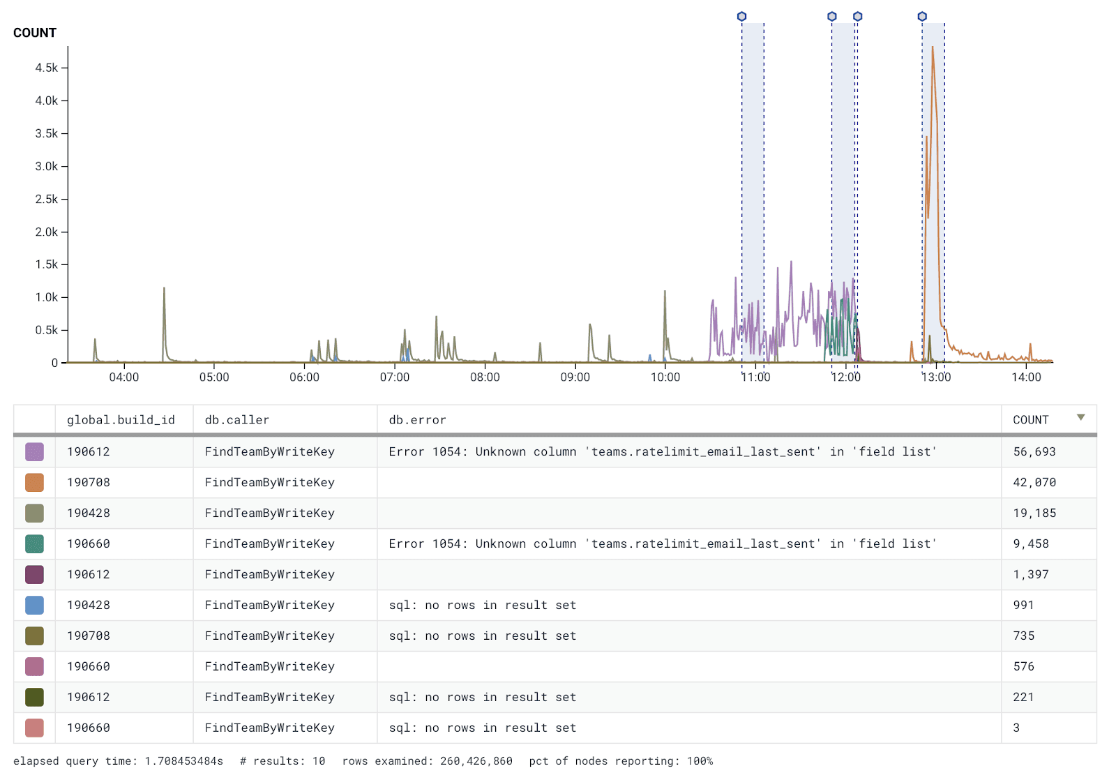 We use deployment version as a column across all of our events, so it was quickly evident when an unexpected mismatch across some hosts occurred. We were able to identify problems by comparing hostname, deployment version, and http response (high-cardinality fields).