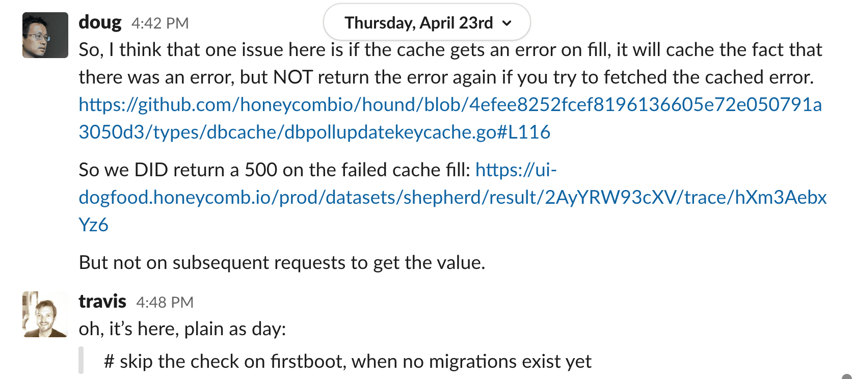 On April 16, we initiated a database migration that was not applied immediately. Normally, our automated deploy process will pause deployments when a migration is pending. However, in this case, a new deployment was still somehow published. Having a newly deployed binary meant that any new hosts created as part of an autoscaling group would get the new build.