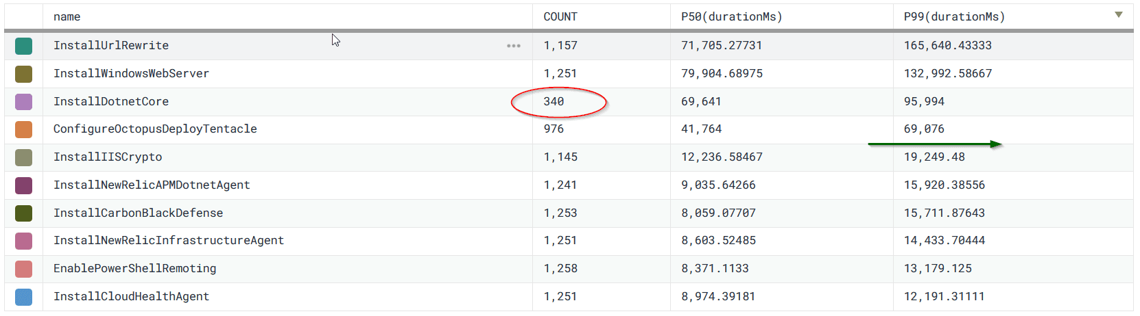 As seen in the above graph, there’s a significant decline in execution time after our four longest run steps. Moreover, one of those longest running steps executes far less frequently than its peers.