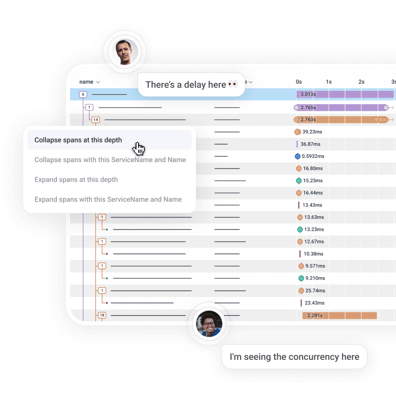 Every team is looking at the same trace view. See what your service did, who called it, and how each dependency responded. No more 'your logs vs. my logs.'